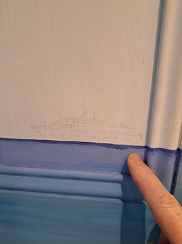 After completion of the parrot, I methodically made my way around the whole bathroom, refreshing everything in my path until I got to the last side by the door. I discovered a faint pencil sketch of an ocean liner that had originally been forgotten or missed. After informing the clients, they requested that I paint and complete it if possible. They also asked if I could place my signature somewhere on the mural but as the mural wasn't mine I felt I shouldn't, but after the go ahead of the ship painting I thought it would be a good opportunity to name the ship after myself! Perfect :)
